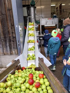 4. Die Äpfel kamen auf das Förderband und wurden unter den wachsamen Augen der Kinder zur Presse transportiert.