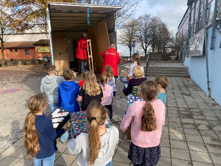 Die Schülerinnen und Schüler helfen fleißig beim Verladen der Geschenke.