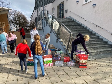 Die Schülerinnen und Schüler helfen fleißig beim Verladen der Geschenke.