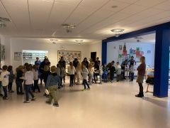 Die Kinder der Klassen 3a und 3b treffen sich in der Aula und werden dort von